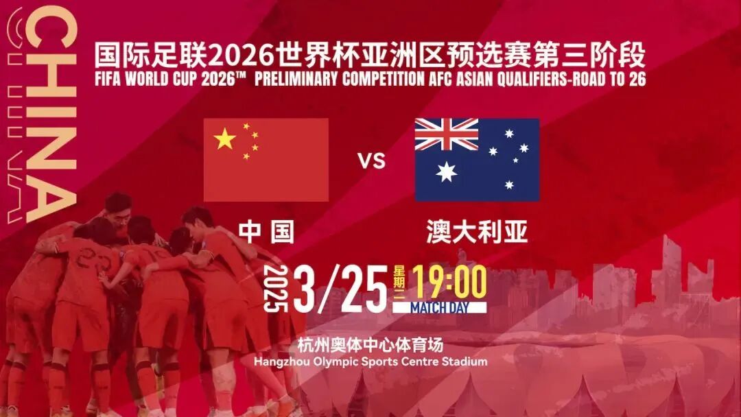2025年3月25日19:00国际足联2026世界杯亚洲区预选赛第三阶段第八轮中国国家男子足球队将坐镇杭州奥体中心体育场迎战澳大利亚国家男子足球队。