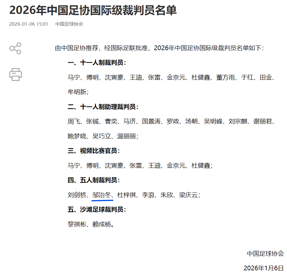 国际级裁判员资质是国际足联(FIFA)认证的最高级别裁判身份。祝贺邹治冬!期待他在国际赛场上继续展现浙江裁判的专业风采。