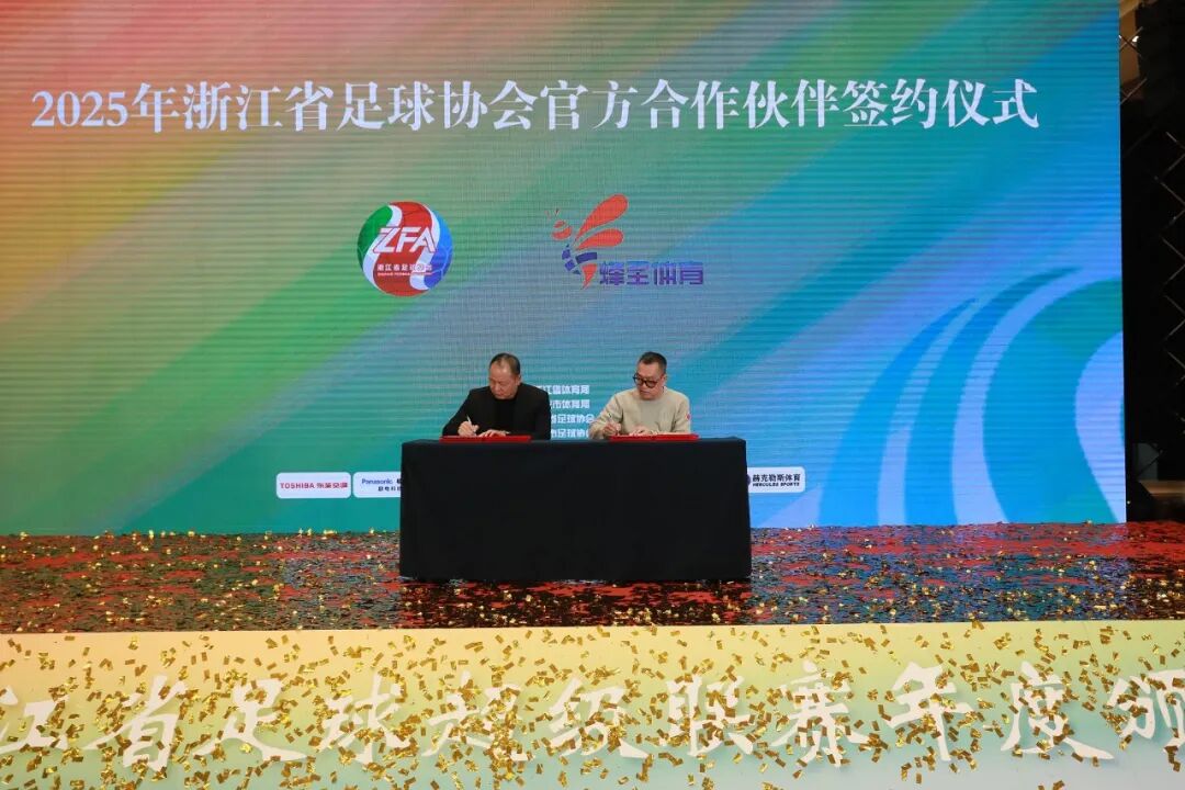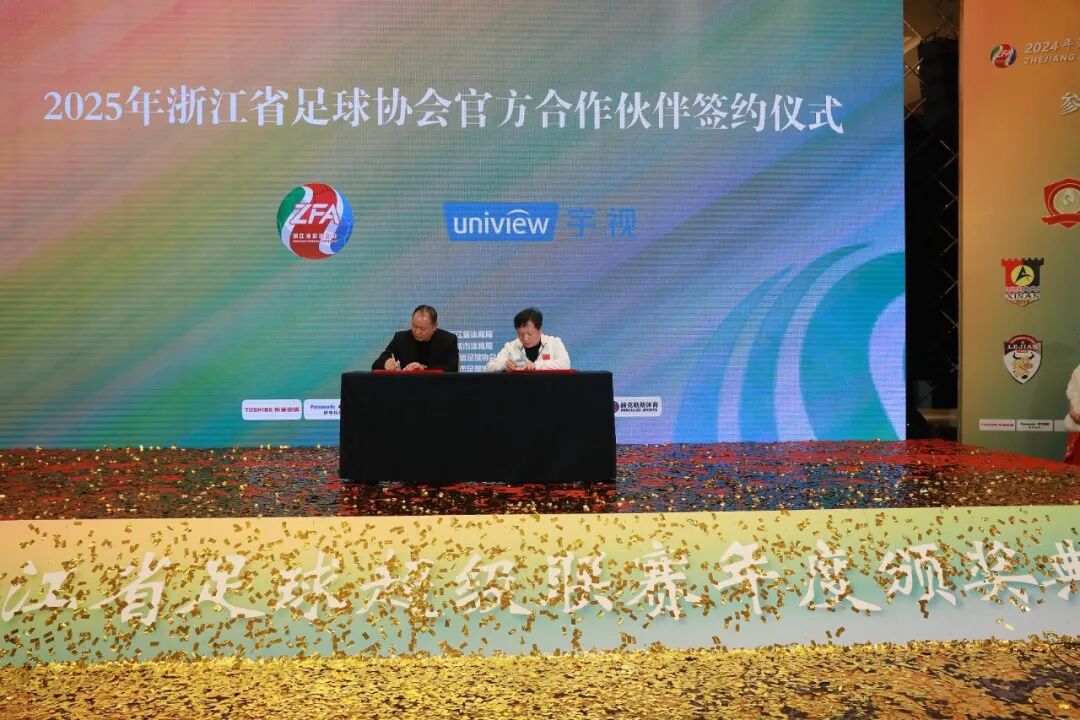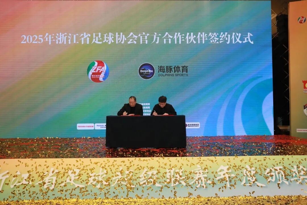 颁奖典礼上还见证了2025年度浙江省足球协会官方合作伙伴的签约仪式,正式宣布杭州蜂至体育传媒有限公司、浙江宇视科技有限公司和海豚文化体育有限公司成为浙江省足球协会官方合作伙伴。