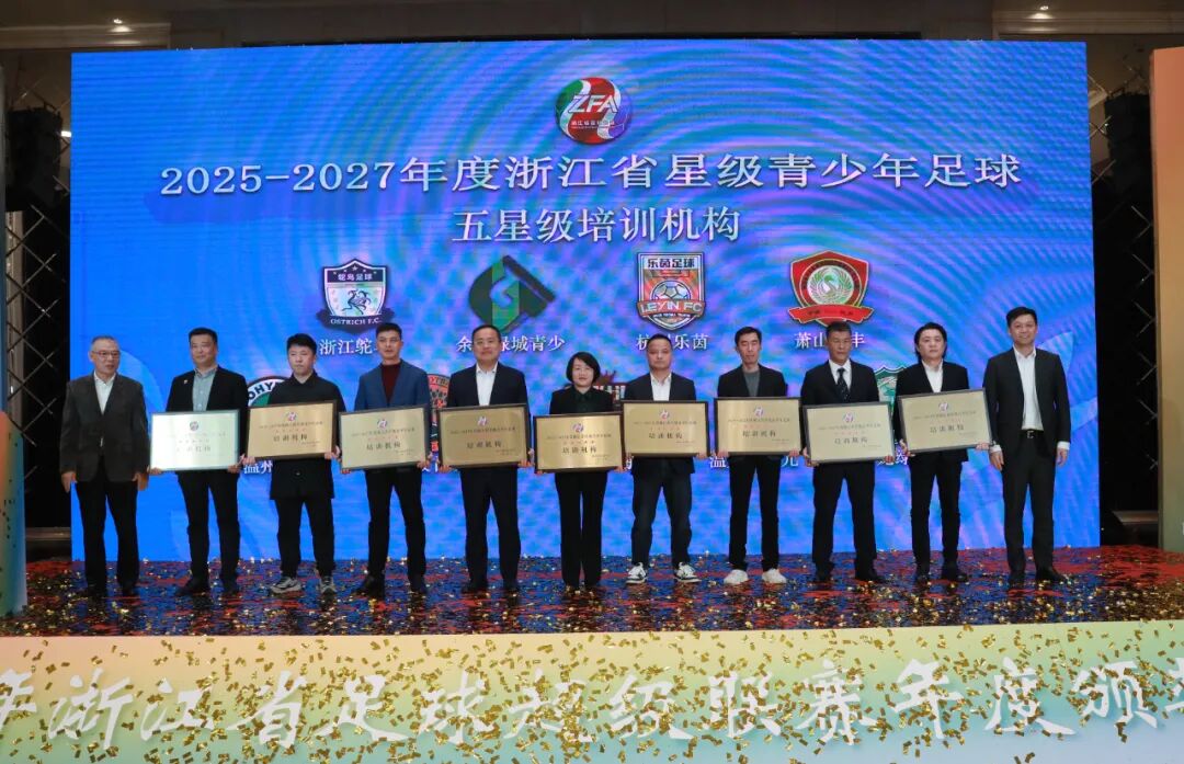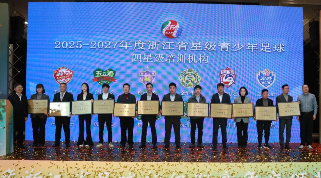 浙超联赛颁奖仪式上还举行了浙江省星级青少年足球培训机构授牌仪式,经过前期征集评选,本年度共诞生了9家五星级、12家四星级、14家三星级青训机构。