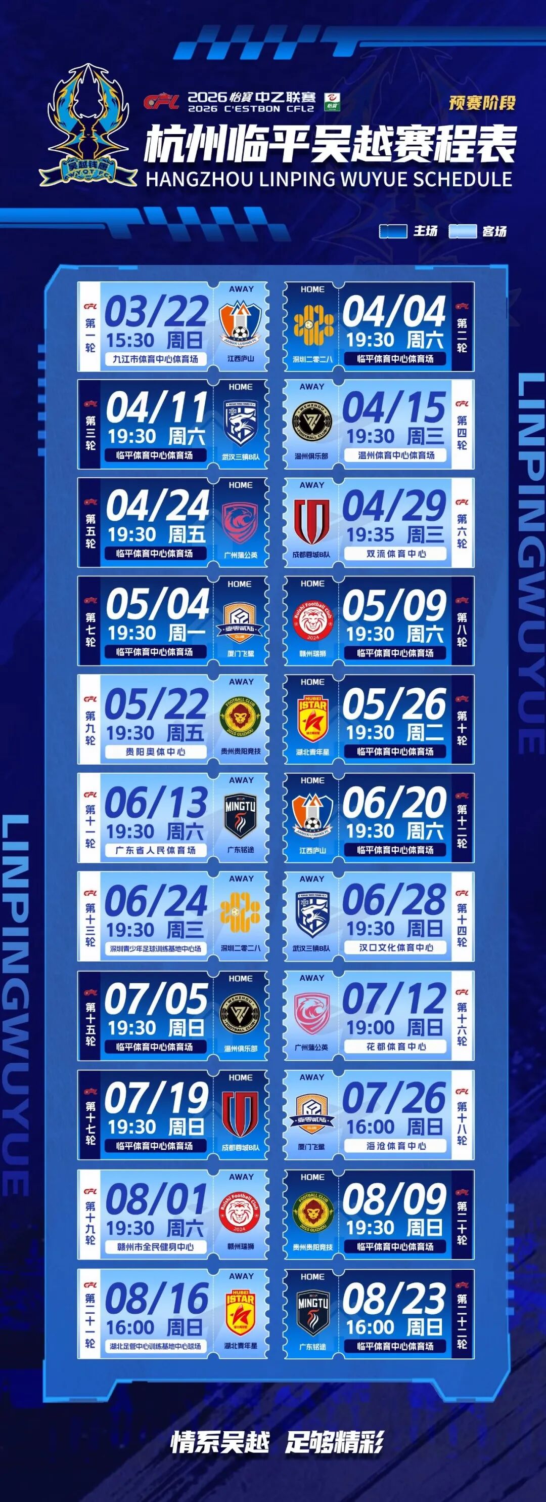 · 杭州临平吴越:3月22日15:30,客场挑战江西庐山(九江市体育中心体育场)