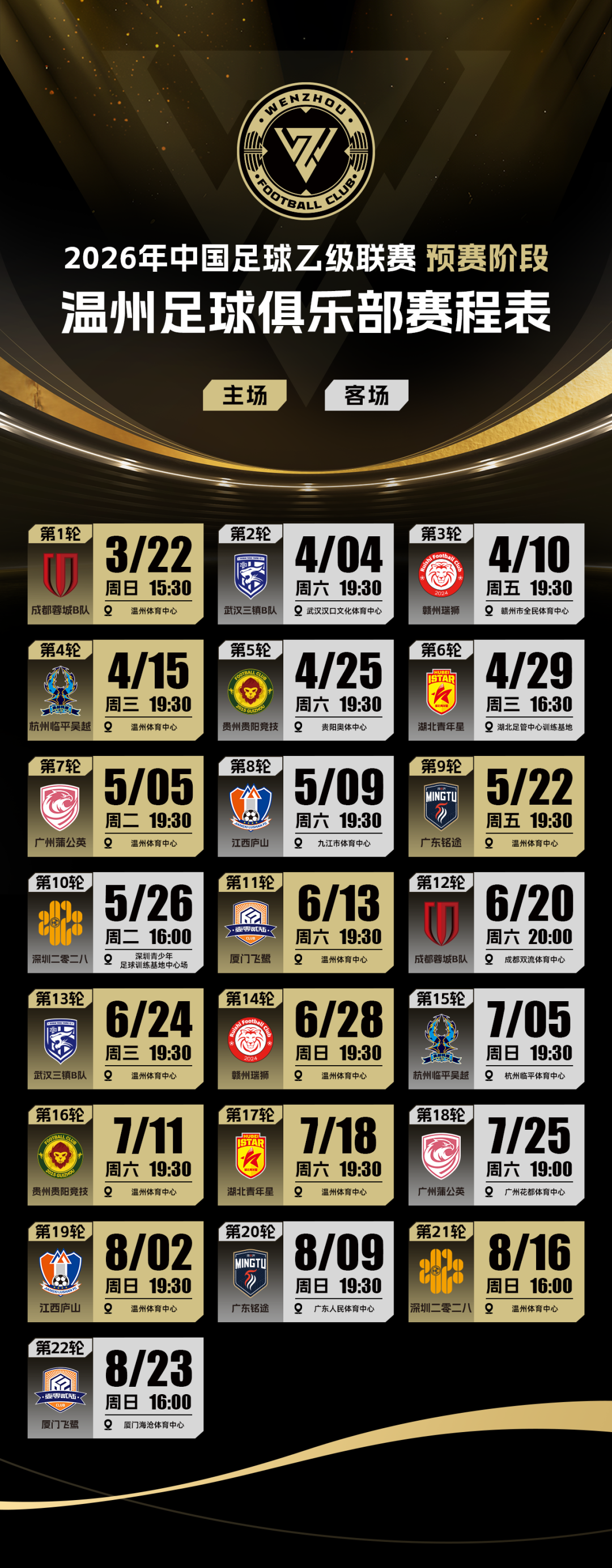 · 温州队:3月22日15:30,主场迎战成都蓉城B队(温州体育中心体育场)