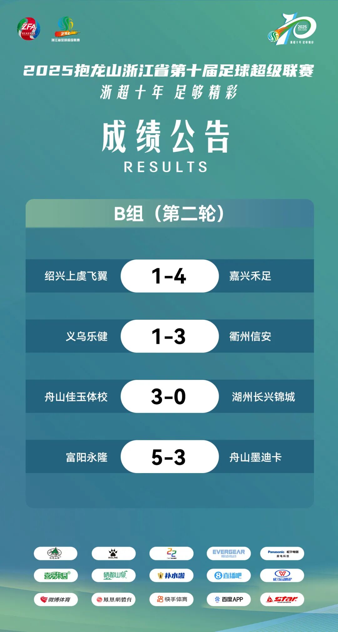 7月13日,浙江省足球超级联赛B组第二轮比赛完赛,绍兴上虞飞翼1-4嘉兴禾足、义乌乐健1-3衢州信安、舟山佳玉体校3-0湖州长兴锦城、富阳永隆5-3舟山墨迪卡。