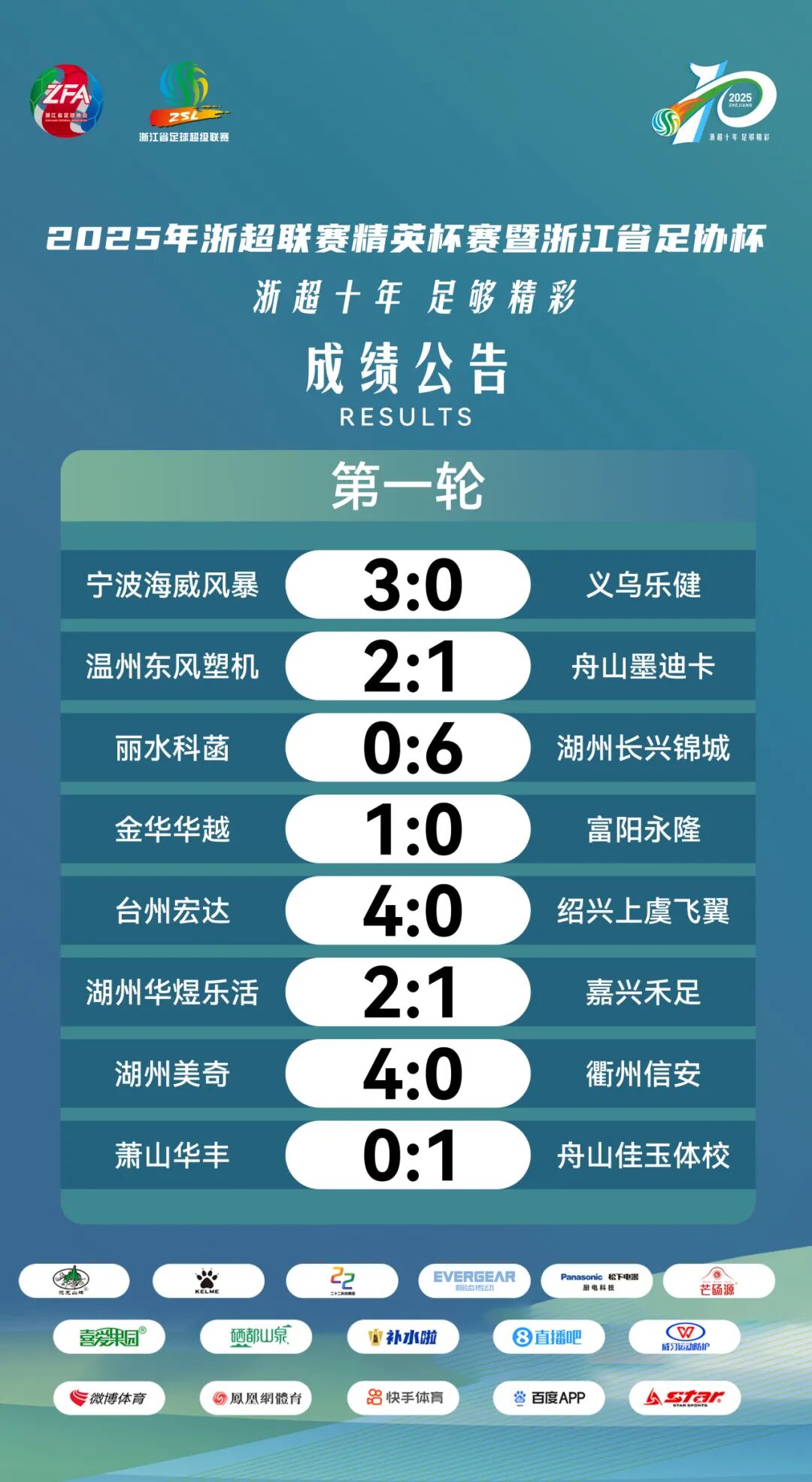 2025年8月31日,2025浙超联赛精英杯赛暨浙江省足协杯第一轮比赛完赛,赛事简报如下: