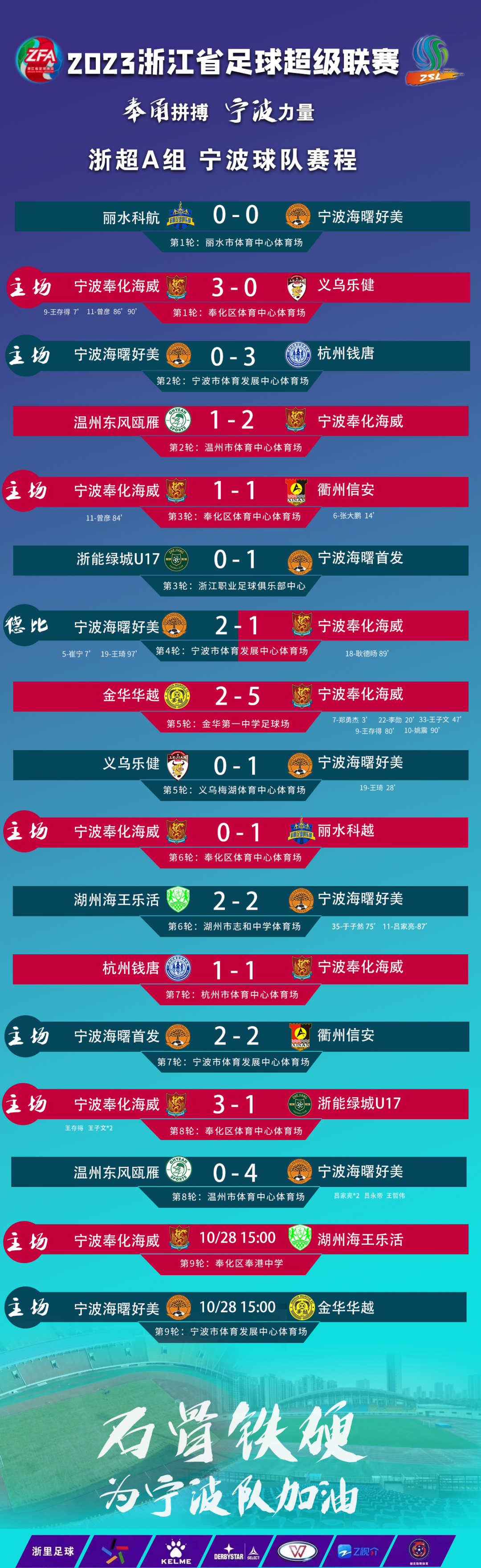 第八轮积分 2023年10月28日,宁波市体育发展中心体育场将迎来浙超年度收关之战。当天下午15:00,由宁波海曙好美主场对阵金华华越,这也是我们最后一个主场!这一路走来,我们坚持不懈,勇往直前,祝队员们继往开来,再创佳绩! 首发足球俱乐部邀请孩子和家长前来观赛,14号看台,橙浪淹海,共赴盛宴,不见不散!