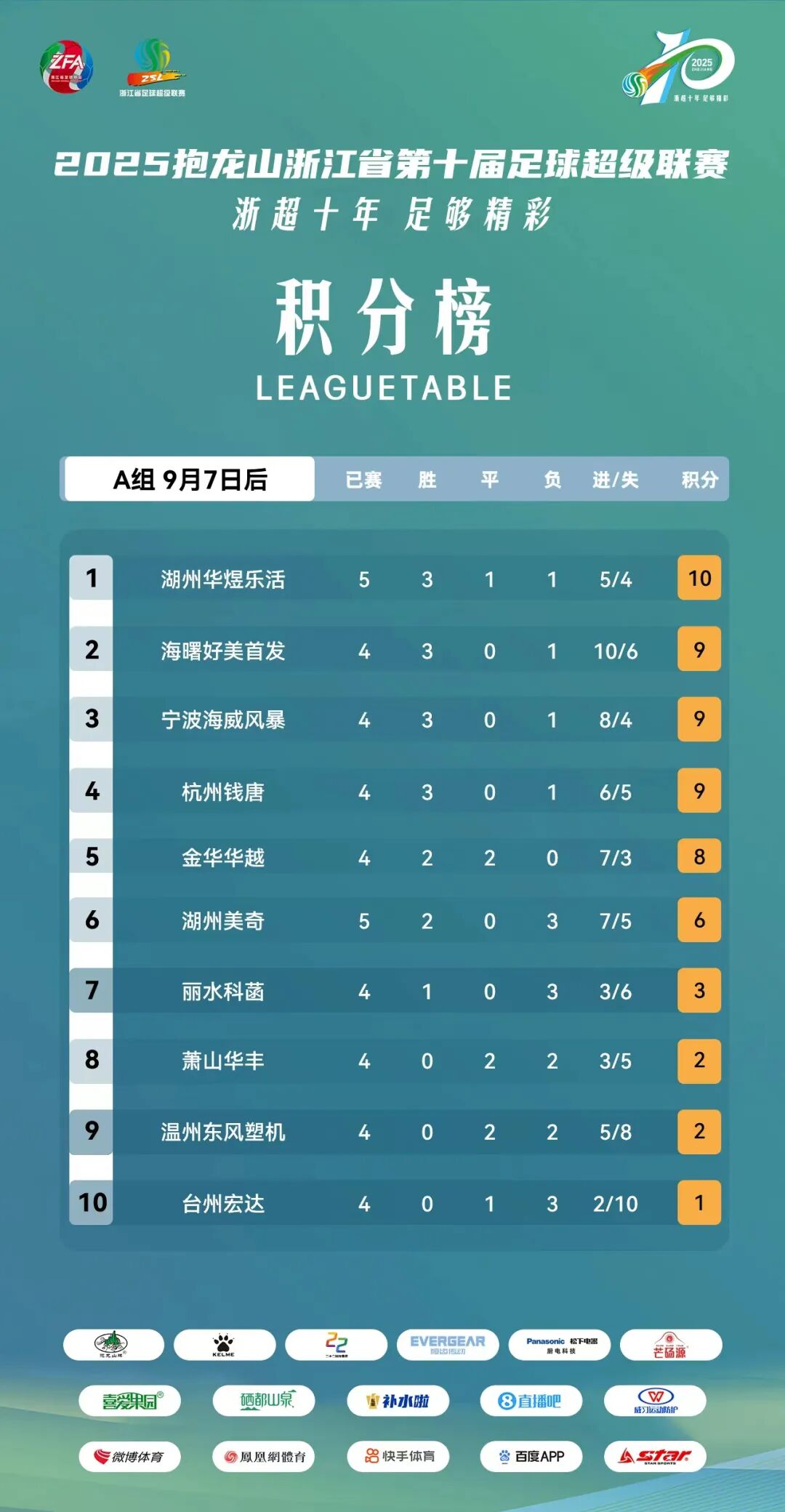 9月7日,2025浙超联赛第四轮比赛完赛。萧山华丰2-2温州东风塑机,海曙好美首发3-1湖州华煜乐活,金华华越2-0湖州美奇,丽水科菡2-0台州宏达,杭州钱唐1-3宁波海威风暴。