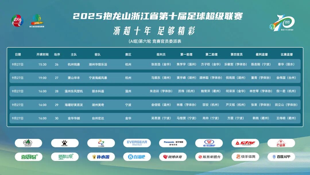 2025年9月14日,2025浙超联赛B组第四轮比赛完赛。嘉兴禾足0-1湖州长兴锦城,衢州信安1-1舟山墨迪卡,绍兴上虞飞翼优翔0-0舟山佳玉体校,义乌乐健1-3富阳永隆。