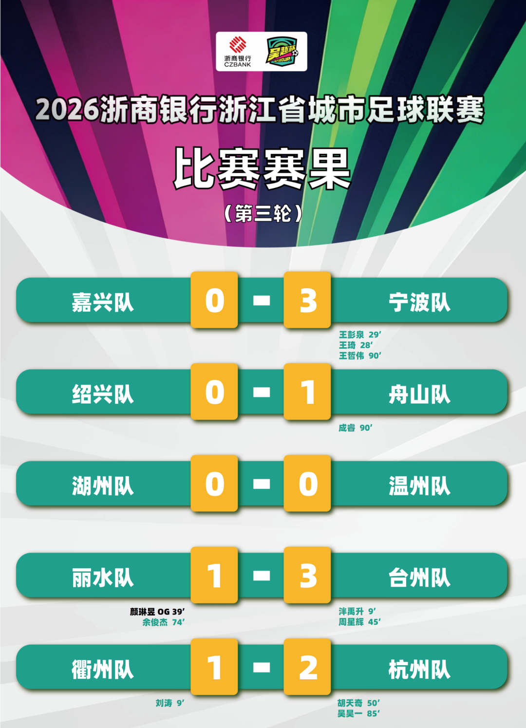 2026吴越杯第三轮比赛于4月17日-4月19日分别在嘉兴、绍兴、湖州、丽水、衢州五个赛区顺利完赛。比赛结果、积分榜、射手榜来了!