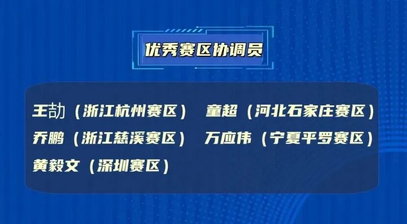 赛事组织方面,浙江的办赛能力也获得认可。浙江杭州赛区与浙江慈溪赛区共同荣获“优秀赛区奖”,两赛区的协调员王劼、乔鹏也获评优秀赛区协调员。