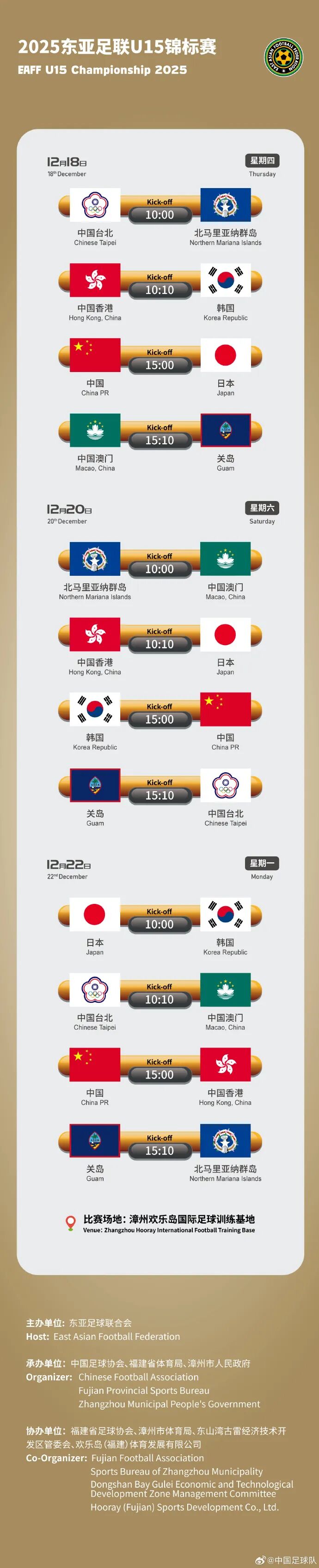 本次东亚足联U15锦标赛将于12月18日至22日在福建漳州举行,由中国队对阵日本、韩国及中国香港三支同龄队伍。这是以2010年龄段球员为班底组建的新一届U15国足,在西班牙籍主帅大卫带领下迎来的首项正式国际比赛,也是球队为备战2027年U17亚洲杯及U17世界杯迈出的坚实第一步。
