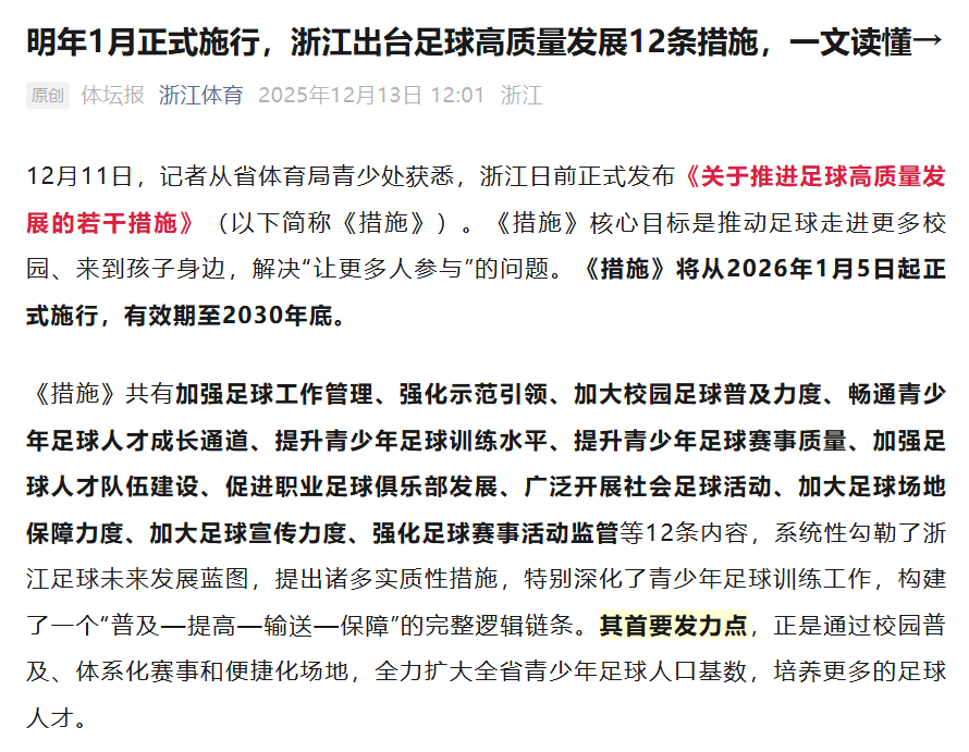 浙江日前正式发布《关于推进足球高质量发展的若干措施》