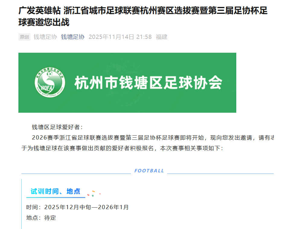 杭州市将依托原有的“足协杯”赛事进行选拔,赛程和规程还在征求意见中,已有部分区县发出了“英雄帖”。