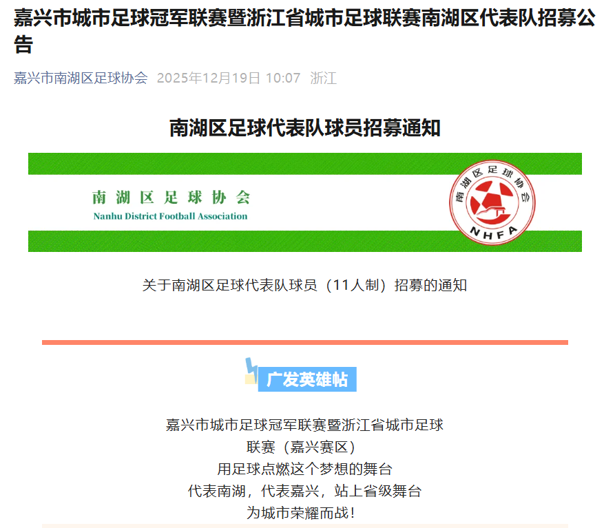 嘉兴方面,据市足协负责人透露,各区县已着手组建代表队;嘉兴城市足球联赛计划于月底开赛,并设40岁以下和以上两个组别,使赛制更丰富、覆盖面更广。