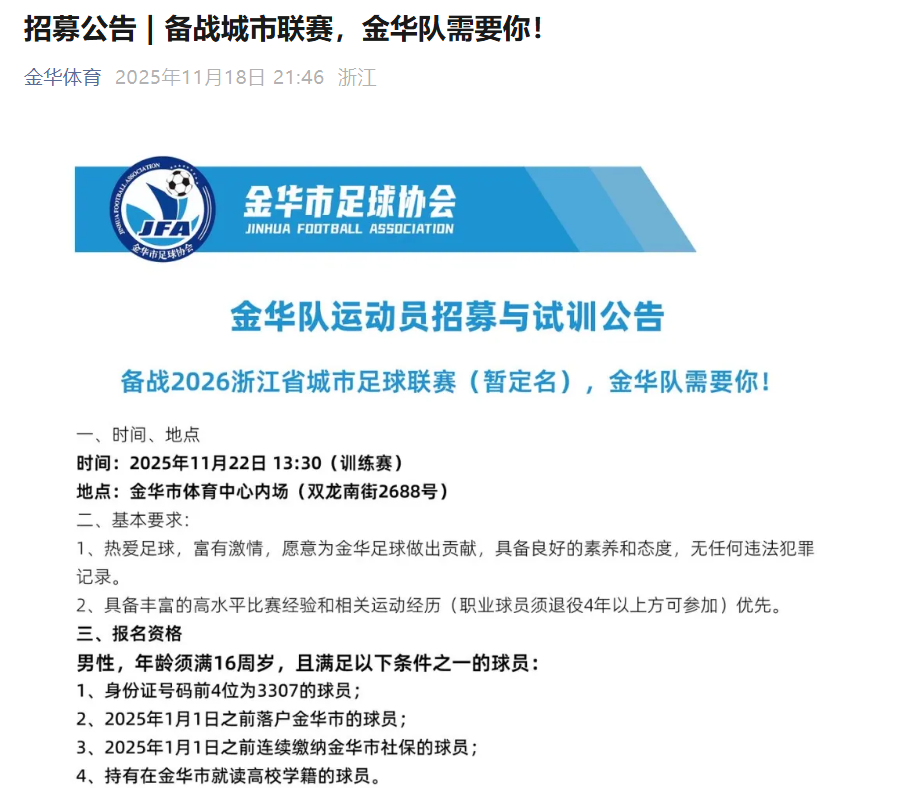 金华、舟山、绍兴、衢州等地也已陆续发布球员招募信息,积极开展赛前组织与准备工作,全省范围内呈现出积极备战的态势。