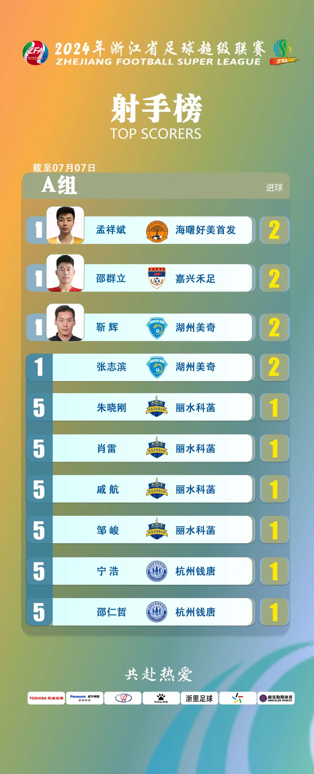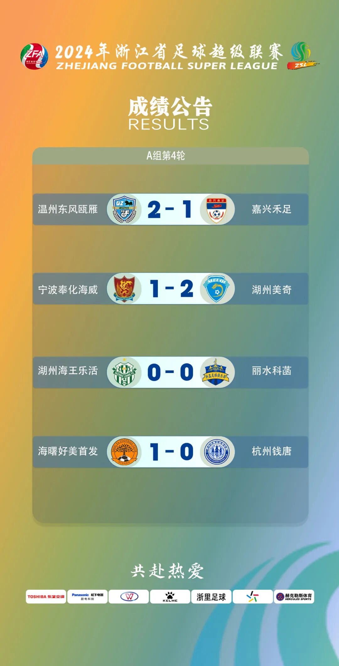 7月6日,2024浙江省足球超级联赛A组第四轮比赛,温州东风瓯雁2-1嘉兴禾足,宁波奉化海威1-2湖州美奇,湖州海王乐活0-0丽水科菡,海曙好美首发1-0杭州钱唐。