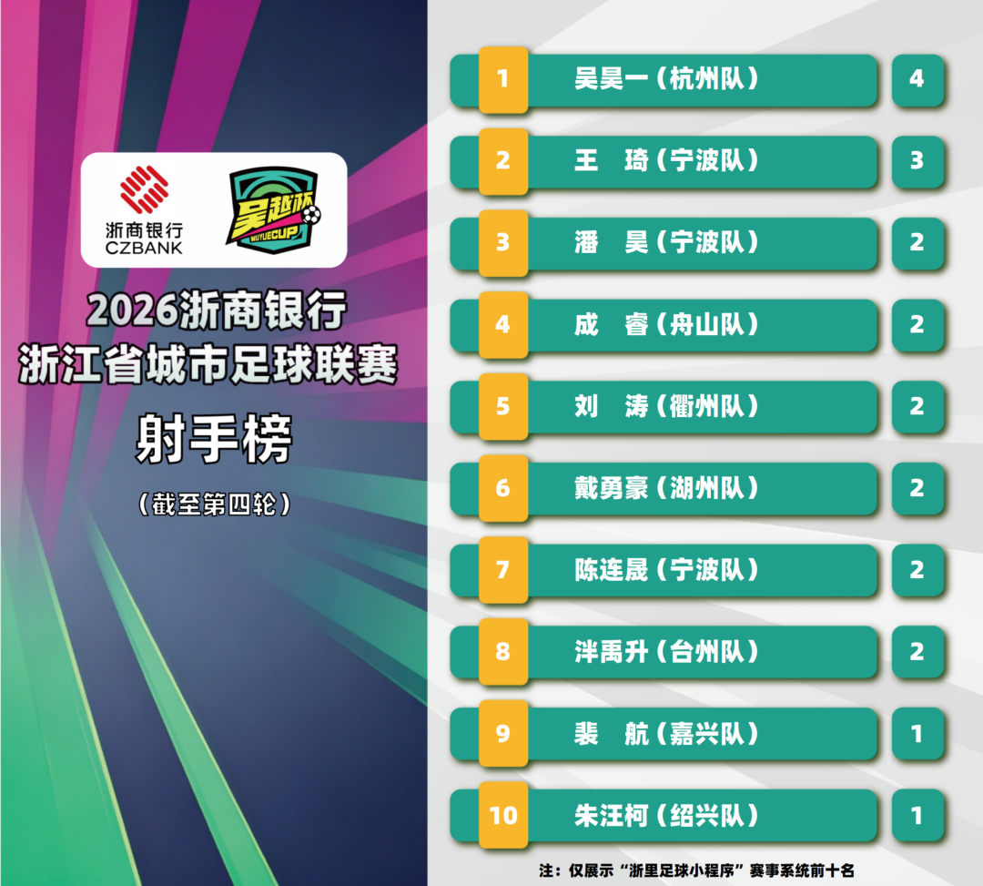 2026吴越杯第四轮比赛于4月22日-4月23日分别在温州、舟山、衢州、杭州、宁波五个赛区顺利完赛。比赛结果、积分榜、射手榜来了!